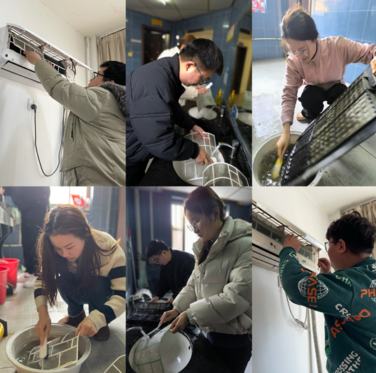 活動期間,大家分工協作、互相配合。志愿者先對空調進行斷電,打開空調蓋板,取出空調濾網,接著使用抹布和清洗劑對空調外機、濾網等部件進行全面細致的清洗。