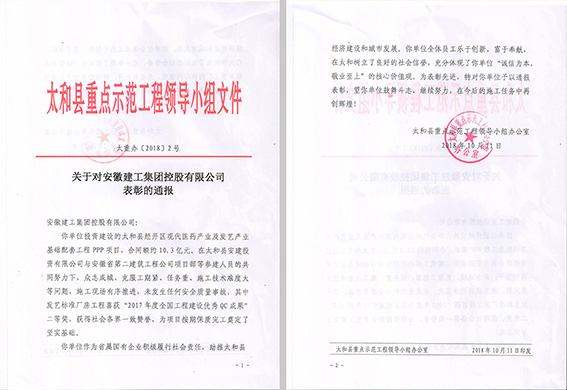 經過兩年的“浴血奮戰”,2018年9月30日,太和PPP項目完成交工驗收工作,項目建設圓滿收官,并受到太和縣人民政府及太和縣重點示范工程領導小組辦公室的一致表彰,為公司品牌宣傳,形象提升做出積極努力,為“打造一流安徽建工”添磚加瓦。