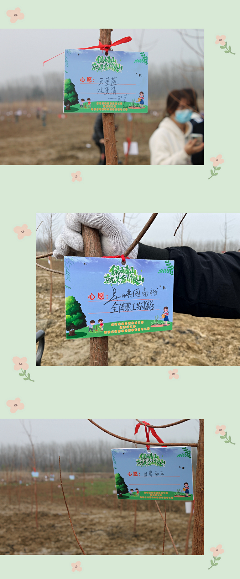 大家個個干勁十足,不畏辛苦,圓滿完成了種植任務,還給自己種下的樹苗掛上了心愿卡片。